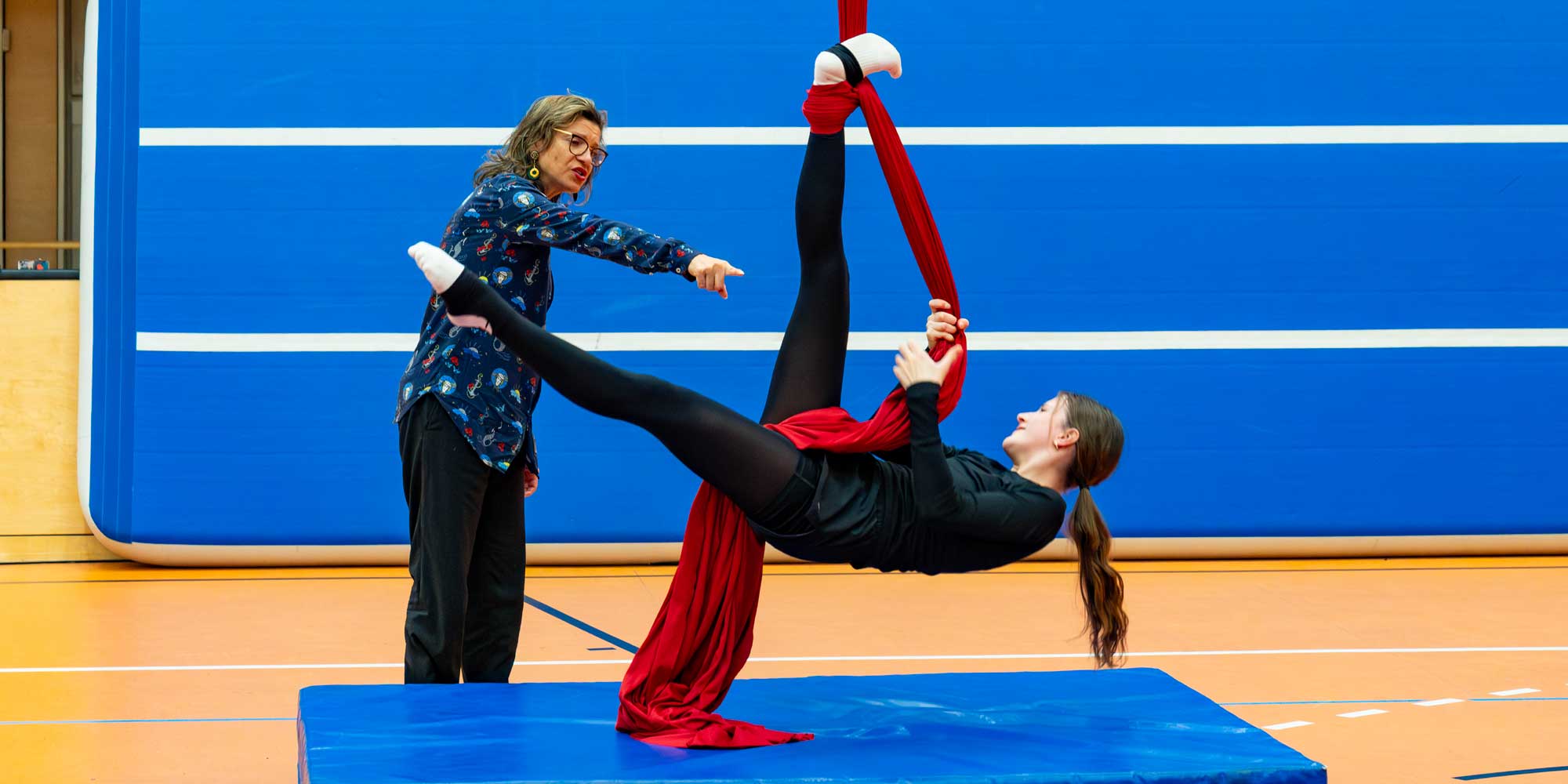 DA SILVA: Mein Schwerpunkt ist definitiv die Luftakrobatik, speziell das Tuch, mit dem ich mich auch auf der Bühne als Künstlerin intensiv auseinandersetze. In Brasilien hab ich auch mit dem Schleuderbrett gearbeitet – allerdings auf einem weniger hohen Niveau. Für mich ist es wichtig, dass der Körper die Grundlage bildet: Kraft, Beweglichkeit, Wahrnehmung. Die Artistik-Tricks kommen erst danach. Das versuche ich so auch im Unterricht zu vermitteln: Die Schüler:innen müssen zunächst ihre Körper kennenlernen, bevor sie komplexe Tricks lernen können.