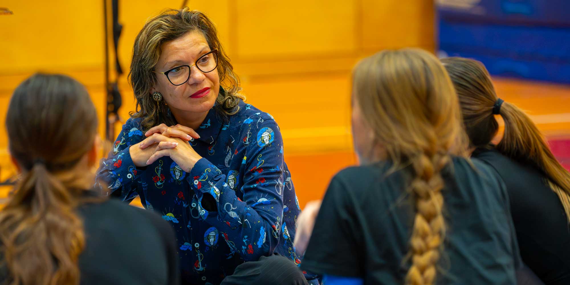 Beo Da Silva im Gespräch mit Artistik-Schülerinnen des 5. Ausbildungsjahres, Foto: Dirk Thiele