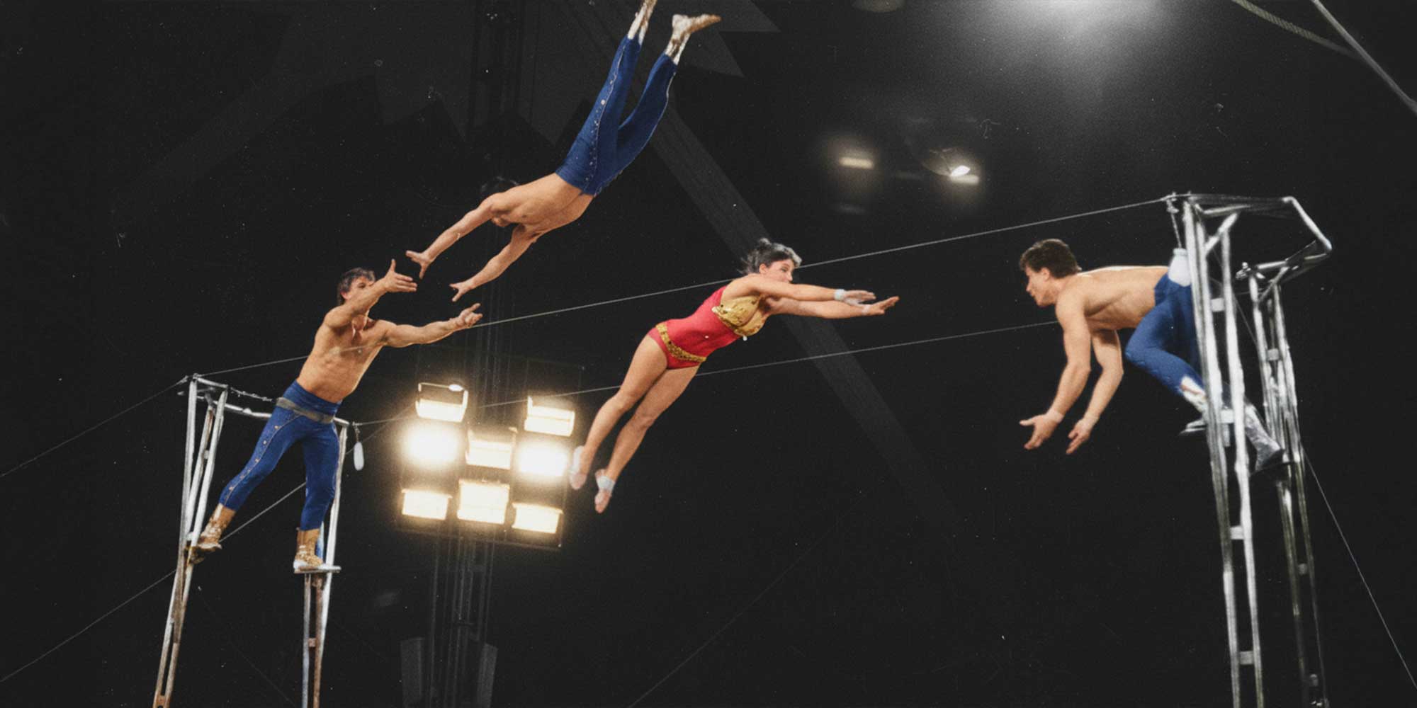 Ronald Wendorf mittig in der Luft, 1984 im Staatszirkus der DDR, Foto: Zirkusarchiv Sascha Bittner