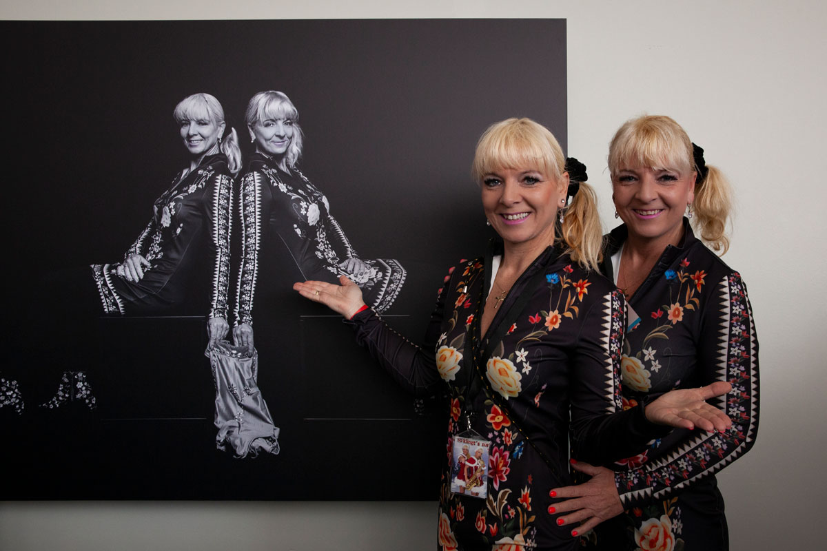 Im Durcheinander der vielen Ehemaligen bewegen sich auf hallenden Absätzen, zwei visuell und akustisch herausstechende Personen. Sie gleichen sich in Kostüm, Frisur und dem lauten Lachen wie ein Ei dem anderen. Das Dresdner Equilibristik-, Gesangs- und Saxophon-Duo „Die Zwillingsherzen“ ist wirklich nicht zu übersehen. Die Geschwister Claudia Hilken und Carmen Schlese haben 1992 die Artistik-Schule abgeschlossen und sind bis heute in der deutschen TV- und Show-Welt bekannt. Man kommt im Prinzip gar nicht dazu, Fragen zu stellen. Muss man auch nicht, denn man wird gleich beiseite gezogen und mit reichlich Informationen versorgt.