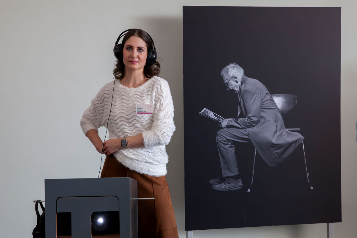 Während im großen Saal die Vorstellungen laufen, begrüßen René Wiese und die Künstlerin Laura Soria die andere Gruppe von Ehemaligen in der Foto- und Videoinstallation „Passage“ zum Tag der Ehemaligen. Auf zwölf fast lebensgroßen Schwarzweißfotos erwachen Ehemalige aller Generationen auf Knopfdruck zum Leben.