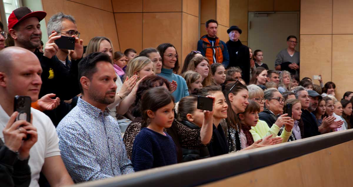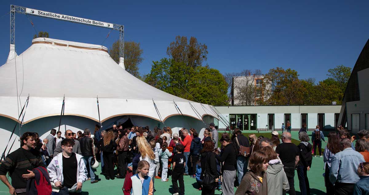 Es ist schwer zu sagen, wie viele Besucher am Samstag, den 25.04.2026 ab 11 Uhr auf dem Gelände der Schule erschienen, aber lange Reihen vor dem weißen Zirkuszelt und den Trainingshallen der Artistik, plattgedrückte Nasen an den Scheiben der Ballettsäle und dichtes Gedränge auf den Sitzreihen sprechen für sich. Man kann getrost von mehr als tausend Menschen ausgehen, die sich ein Bild von der Arbeit der Schülerinnen und Schüler, wie auch der Lehrkräfte und dem Verwaltungspersonal der Schule machen wollten. Darunter natürlich vor allem die Eltern und Geschwister der Schüler:innen aus beiden Fachbereichen, aber auch interessierte Gäste ohne Bindung zur Schule, Anwohner aus der näheren Umgebung und Fachleute der Branche mit offenen Augen für die großartigen Talente.