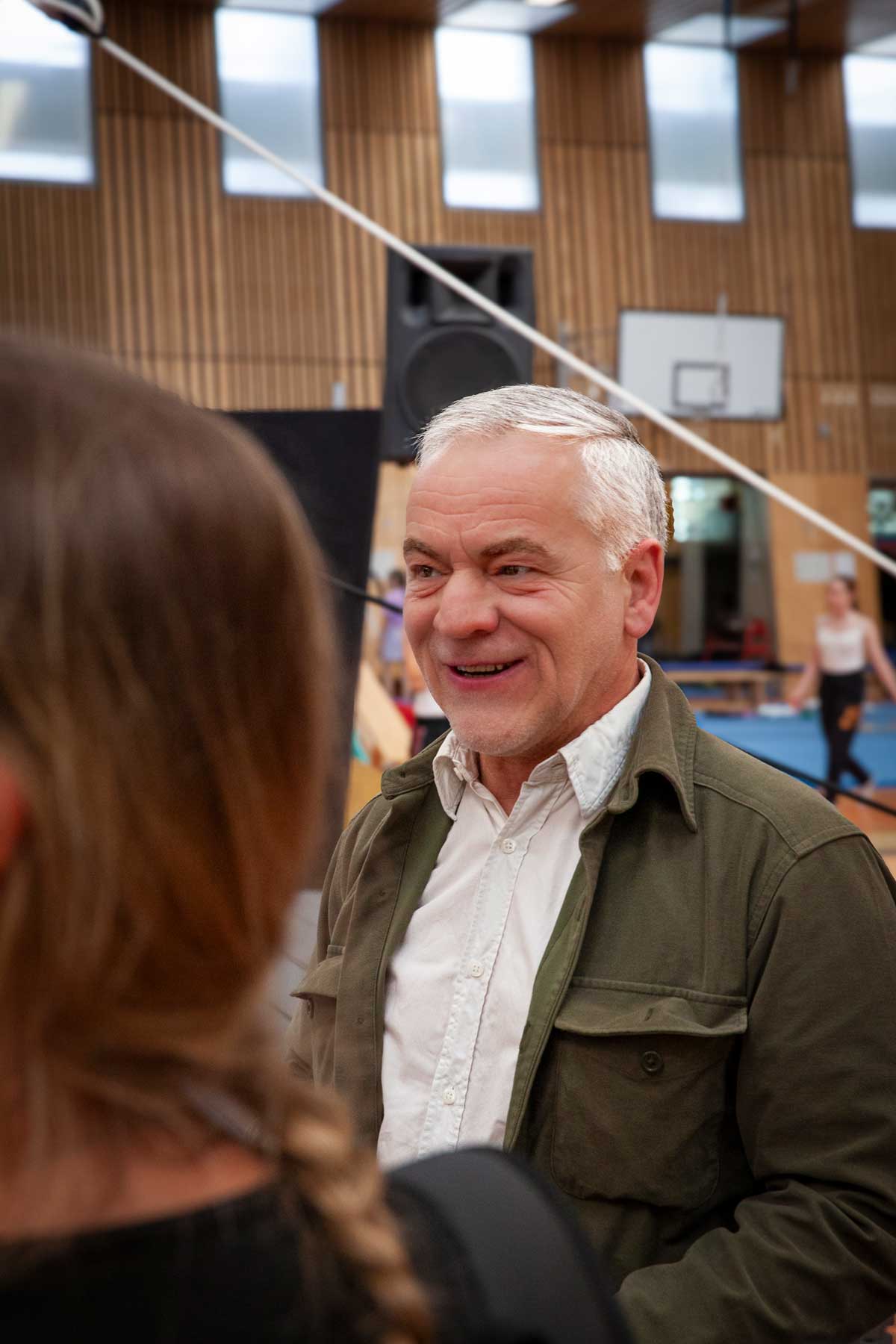 Ebenfalls gerade zwischen Hauptgebäude, dem Zelt und den Trainingshallen unterwegs, um die einzelnen Vorführungen anzumoderieren, ist Uwe Podwojski, der Koordinator der Proben und Auftritte im Fachbereich Artistik. Er betreut auch die Leitung der Talentegewinnung und deshalb ist es auch für ihn eine besondere Veranstaltung.