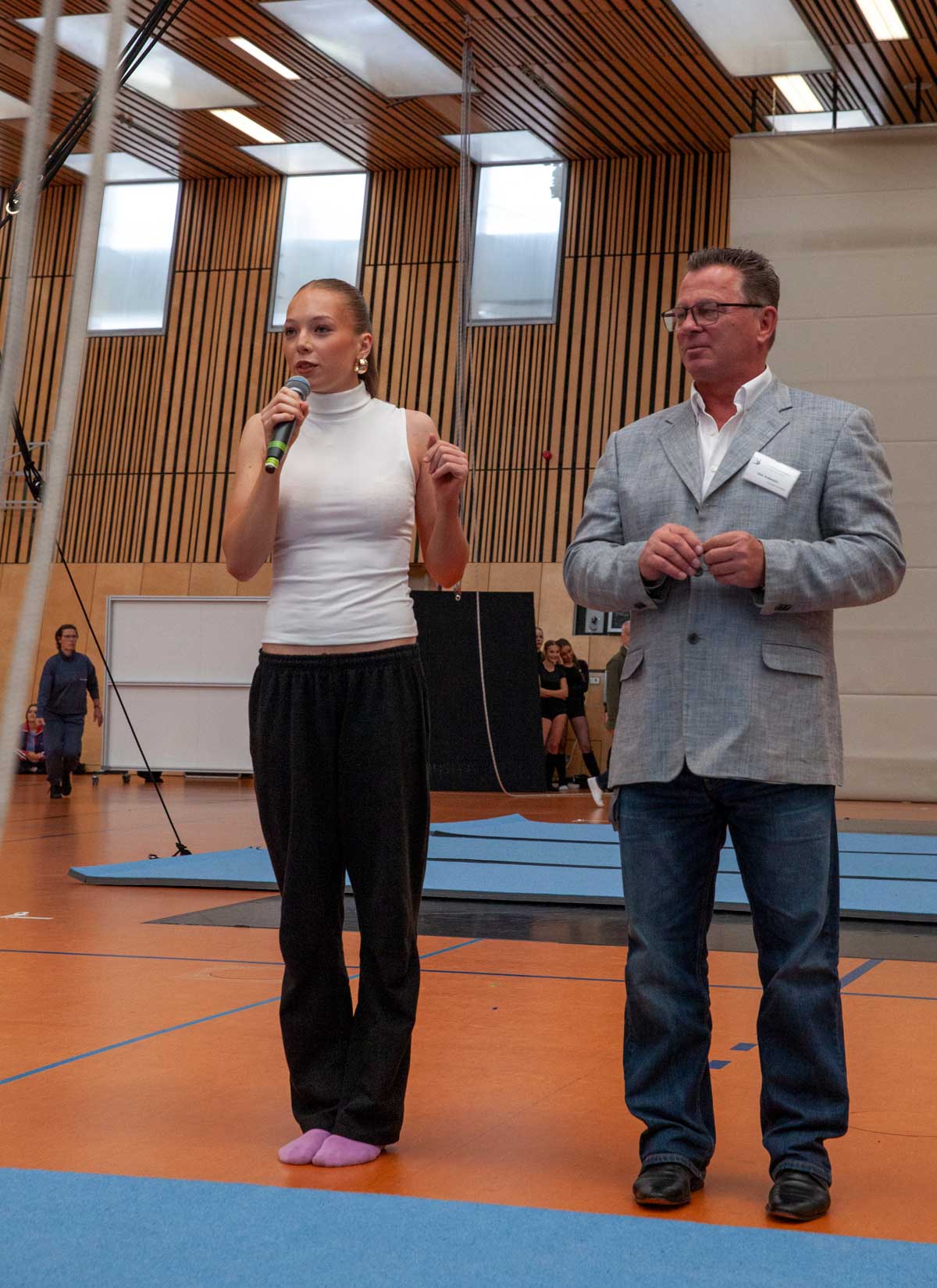 „Wir sind eine sehr besondere Schule, keine reine Sportschule, wie manche denken - wir sind eine künstlerisch-kreative Schule. Wir haben den Anspruch, und das spüren und sehen alle Gäste am Tag der offen Tür, [nbsp]das hier Sportliches und Kreatives parallel entwickelt wird. Auftritte, wie heute sind extrem wichtig gerade im ersten Jahr. Das ist ein Teil des Lernprozess, dass die Kids ihre artistischen und tänzerischen Grundlagen auch gern präsentieren.
