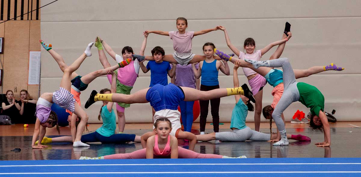 Zwanzig Minuten Leistungsschau in Artistik und Dance zeigten den begeisterten Eltern und anderen Gästen, was die Kinder alleine schon im ersten Jahr an Fähigkeiten entwickeln und wie selbstbewußt und farbenfroh sie mit ihrer Choreographie vor einem großen Publikum auftreten.